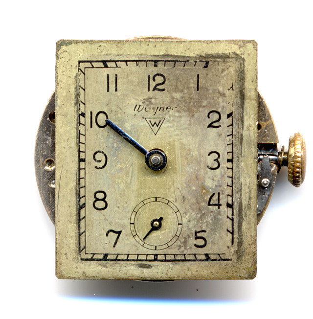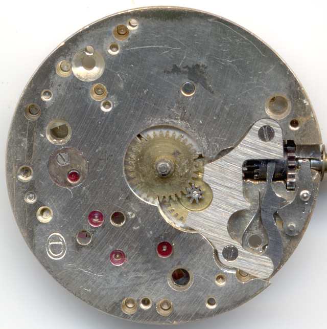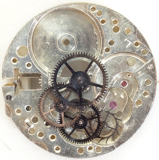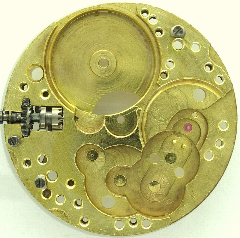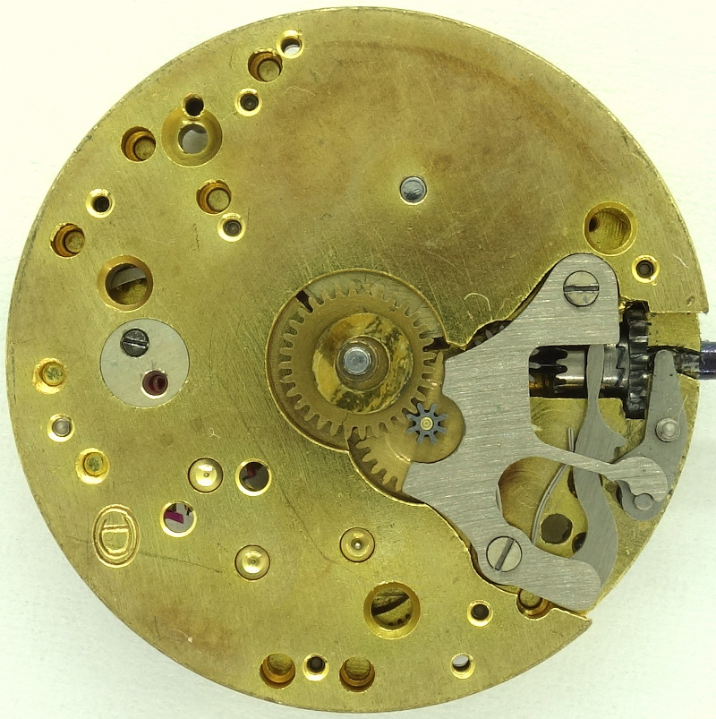 Die Zifferblattseite bietet keine großartigen Überraschungen. Natürlich wird hier, wie bei besseren Werken üblich, ein Kupplungsaufzug eingesetzt. Und wie bei den meisten alten Werken, ist auch hier die Winkelhebelfeder gebrochen. Mit ihrem eckigen Ausschnitt hilft sie bei der Identifikation des Werks.