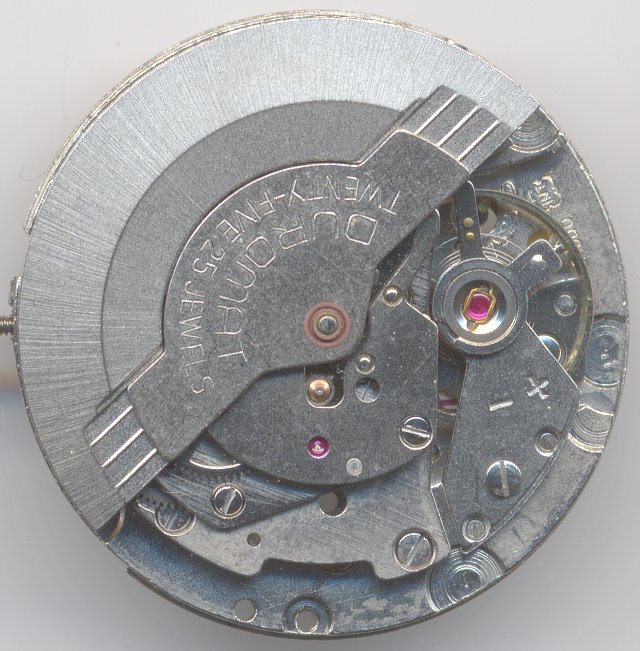 Das hier gezeigte Kaliber 7525 aus den frühen 70er Jahren gehört schon zu einer der spätesten Werkfamilien, besitzt aber noch den charakteristischen Rotor mit “Duromat”-Schriftzug, der in den darauffolgenden Werken keinen Platz mehr auf dem dann verwendeten Viertelrotor fand.