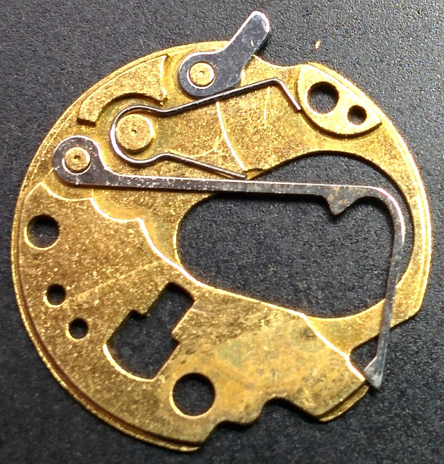 Die Ausführng des Datumsmechanismus ist wieder eine ziemlich geniale Konstruktion, die aus ganzen sechs Teilen besteht, einer Deckplatte, einer Feder, zwei Hebeln, einem Zahnrad und einem Schaltnocken. Und man mag es kaum glauben, die Montage ist sehr einfach, wenn man ihn, wie auf den Bild gezeigt, verkehrtherum liegend vormontiert.