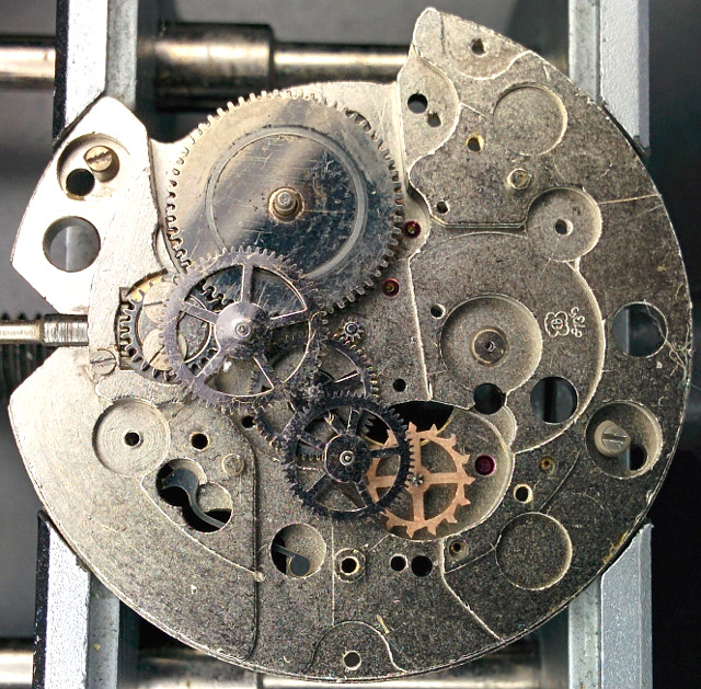 In die beiden Steinlager bei 10 und 11 Uhr greift eine (im vorliegenden Werk leider nicht mehr vorhandene) Sperrklinke samt Feder ein, die beiden anderen Lager bei 3 und 3:30 Uhr beherbergen zwei Untersetzungszahnräder.