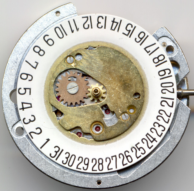 Der Schaltnocken bei “9”, der von einem hier im Bild noch nicht montierten Übertragungsrad bewegt wird, sorgt dafür, daß das Datum schlagartig um Mitternacht weiterschaltet, indem in der Zeit vor 24 Uhr der oben zu sehende Hebel nach Oben vorgespannt wird und bereits in die Datumsverzahnung des Folgetags eingreift. Punkt Mitternacht löst der Schalthebel aus, fällt nach unten und schaltet den Datumsring eine Position weiter. Der andere Hebel bei 12 Uhr sorgt dafür, daß das Datum sicher einrastet und nicht rückwärts verstellt werden kann. Eine halbschnelle Korrektur durch Vor- und Zurückdrehen von 21 bis 24 Uhr ist selbstverständlich möglich.