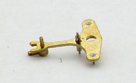 Da die Grundplatine des EB 8800 ohne Begrenzungsstifte für den Anker auskommt, hat sich EB hier mit einem Kniff beholfen: Auf der Unterseite des Ankers (auf dem Foto liegt der Anker mit seiner Unterseite nach oben!) wird der Befestigungs-Stift der Ankergabel einfach soweit verlängert, daß er in ein Loch auf der Grundplatine eingreift. Der Durchmesser dieses Lochs ist genau so gewählt, daß der der Stift in beiden Endpositionen des Ankers sein Rand berührt. Dadurch wird eine Beschädigung der feinen Anker-Stifte beim Prellen der Unruh ausgeschlossen.