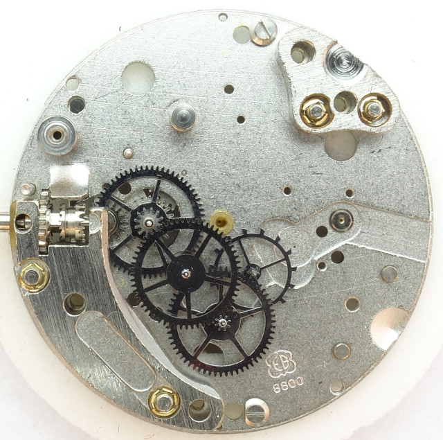 Das Räderwerk ist recht modern konstruiert, das große Federhaus treibt das Großbodenrad an, welches mit einer Rutschkupplung versehen ist (später mehr dazu) und zifferblattseitig das Zeigerwerk antreibt. Anschließend folgen Kleinbodenrad, Sekundenrad (das eine dezentrale Sekunde auf 6 Uhr ermöglicht (ebenfalls als EB 8800 bezeichnet) und das filigrane Ankerrad mit seinen vergleichsweise kleinen Zähnen.