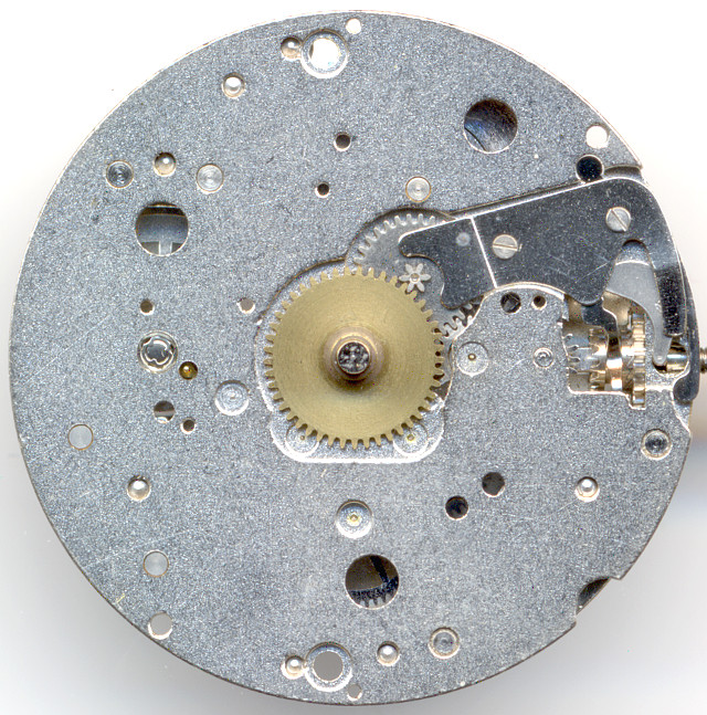 Die Grundplatine zeigt bereits die sehr wirtschaftliche Bauweise - es handelt es sich hier um eine Pfeilerbauweise, die darin gipfelt, daß sogar das Federhaus auf einer starren Achse gelagert ist. Lagersteine sucht man in dieser Ausführung vergeblich, es gibt allerdings andere Versionen dieses Werks, die bis zu 21 Steine verbauten.