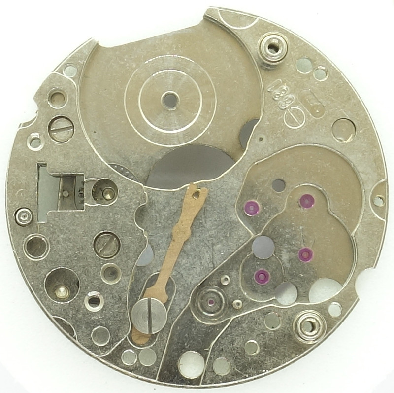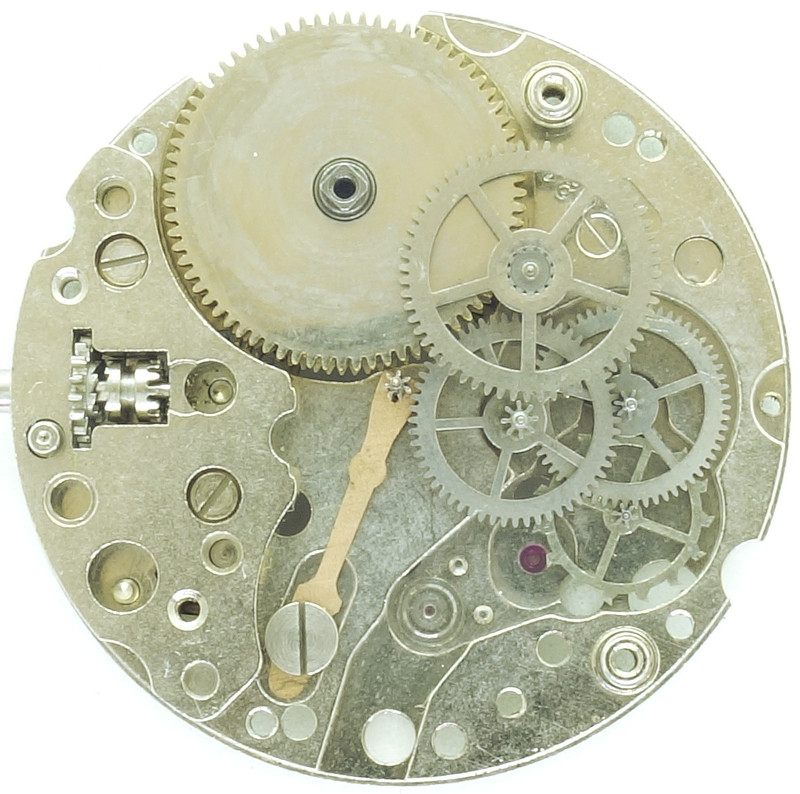 Auf der noch leeren Zifferblattseite läßt sich schön der Kupplungsaufzug erkennen, der ebenfalls eine sehr rationelle Konstruktion ist, besteht er doch lediglich aus einem einzigen Bauteil, dem Winkelhebel, der gleichzeitig seine Winkelhebelfeder ist.