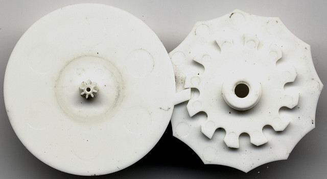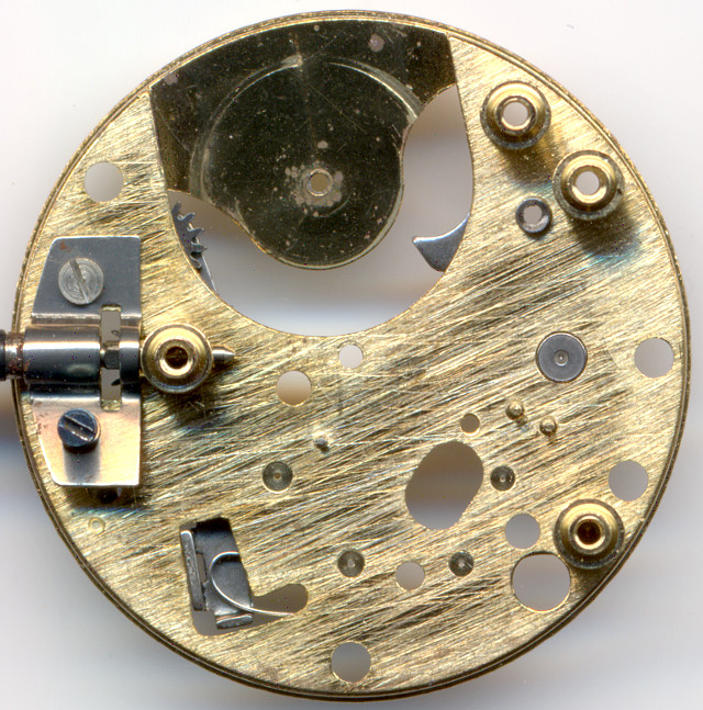 Das Minutenrohr fehlt in dieser Ausführung, da es eine (Plastik) Einheit mit der Minutenscheibe bildet. Das Wechselrad hat keine Wechselfunktion, sondern dient hier lediglich zur Übertragung von der Wippe zur Minutenscheibe beim Stellen der Zeit.