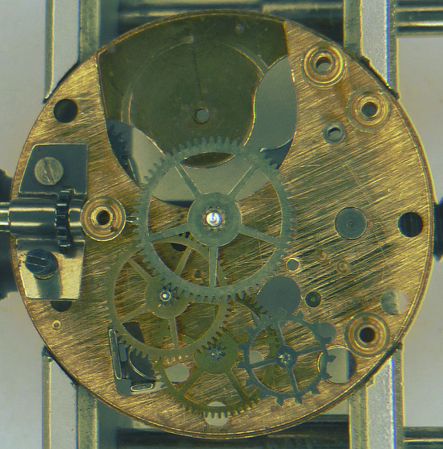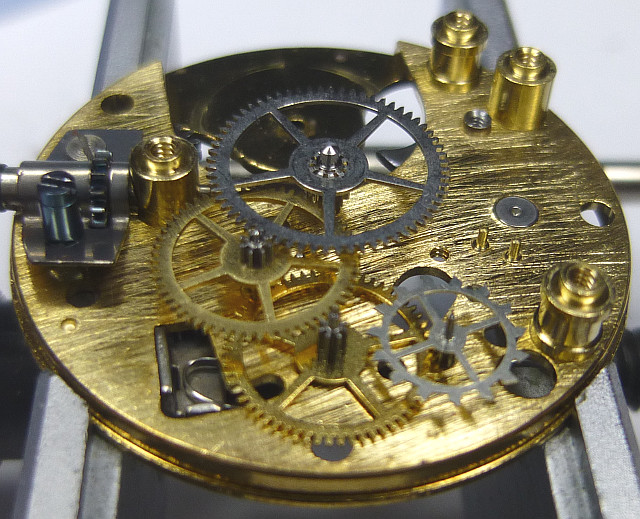 Das komplette Räderwerk liegt unter einer Platine, lediglich das Federhaus kann über einen herausschraubbaren Trieb seitlich entfernt werden.