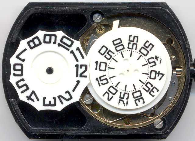 Der Mitnehmer der Minutenscheibe greift dabei um die volle Stunde in die Verzahnung der Stundenscheibe ein. Um die volle Stunde ist die Minutenscheibe eingebuchtet, so daß die sternförmig ausgebuchtete Stundenscheibe hier Platz zum Wechseln hat, und anschließend sofort und unverrückbar wieder in Position gehalten wird,