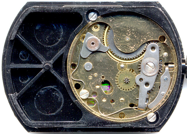 Das Werk ist mit zwei Schrauben im Container fixiert. Um es auszuschalen, sind beide Schrauben zu lösen, sowie von der Rückseite des Containers der Stöpsel zu entfernen und die Winkelhebelschraube so weit wie nötig aufzudrehen, um die Aufzugswelle zu entfernen.