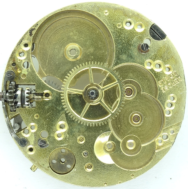 Es kommt der typische Zylinderwerk-Aufbau zum Einsatz mit direkt angetriebenem Minutenrad, Kleinbodenrad, Sekundenrad und schließlich dem, unter einem eigenen Kloben gelagerten, flachen, Zylinderrad.