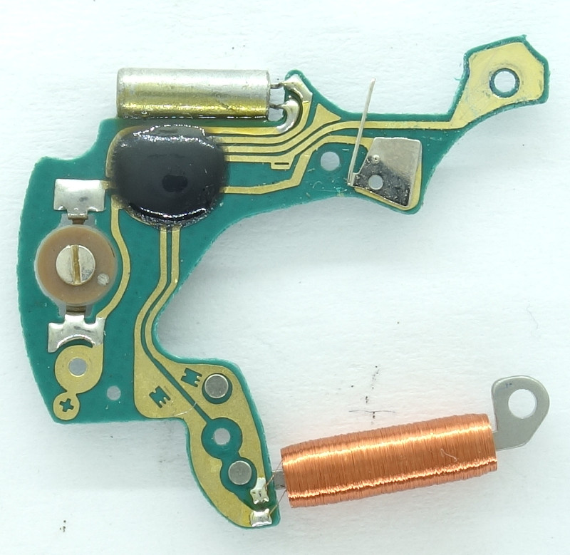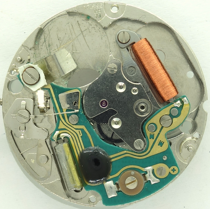 Die Elektronik fällt zeitgemäß klein aus, der Chip ist auf die Platine gebondet (nur noch als schwarzer Klecks sichtbar), der Quarz hat einen kleinen Durchmesser, aber es gibt immer noch einen Trimmkondensator, mit dem die Ganggenauigkeit justiert werden kann.