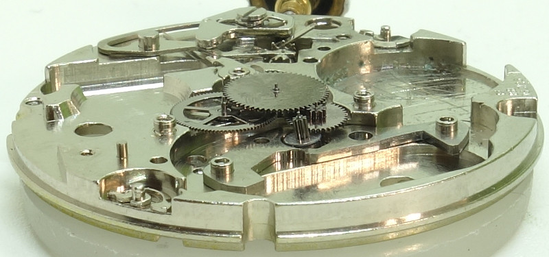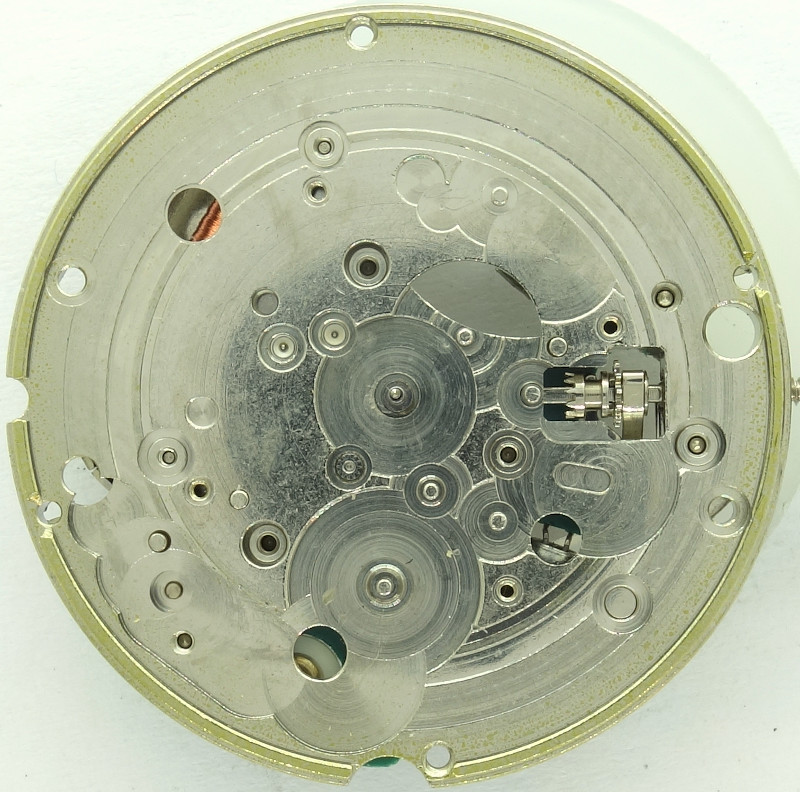 Das Räderwerk ist typisch für ein zeitgemäßes Quarzwerk: Es beginnt mit dem Rotor des Schrittmotors, gefolgt von einem Zwischenrad, dem Zentralsekundenrad und dem Kleinbodenrad, welches zifferblattseitig das Zeigerwerk antreibt.