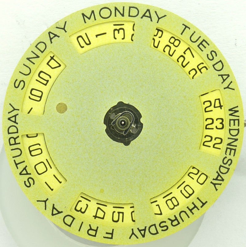 Die Wochentagsscheibe die hier so ausgeführt ist, dass der Wochentag außerhalb des Tags und ausgeschrieben angezeigt werden kann, besitzt auf seiner Unterseite das Sternrad, das zur Fortschaltung und zum Fixieren in seiner Position dient.