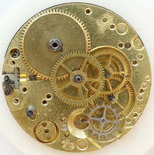 Der Aufbau des Werks erinnert noch sehr stark and die damals üblichen, preiswerten Taschenuhrenwerke mit Zylinderhemmung, und dennoch gibt es eine nicht wirklich zu erklärende Besonderheit: Das Kronrad hat keinerlei Funktion, da der Aufzug von der Zifferblattseite her erfolgt und das Gesperr wie üblich auf das Sperrad einwirkt!