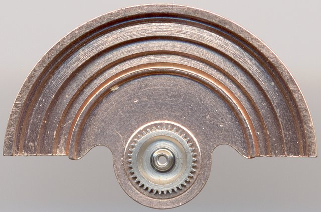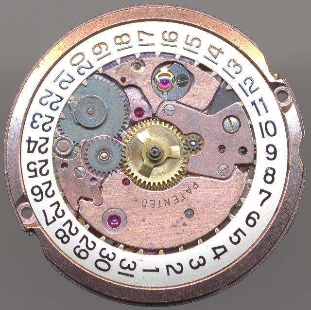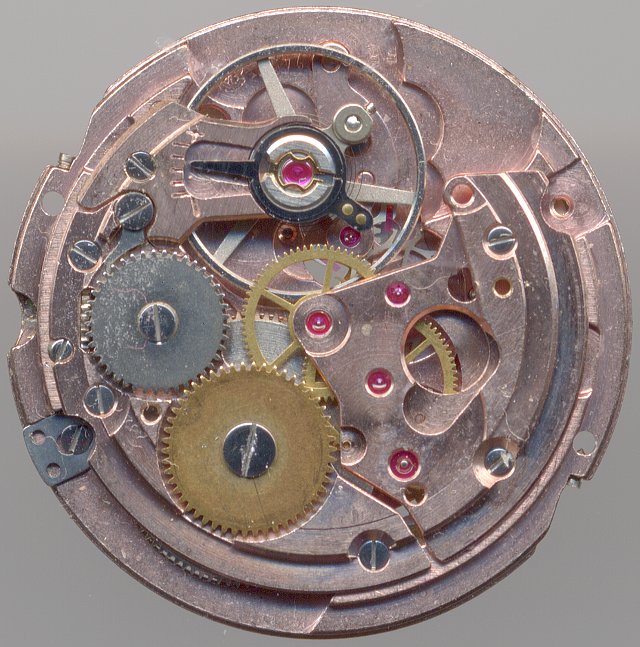 Die vergleichsweise große Verzahnung des Rotors treibt ein vierstufiges Reduktionsgetriebe mit Klinkenwechlser an - eine Konstruktion, die bis heute noch in Werken wie dem ETA 2824-2 verwendet wird.