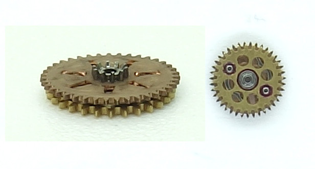 Interessant übrigens, dass die frühen ETA-Automaticwerke noch Klinkenräder mit einem Hohltrieb hatten, und auf sehr massive Achsen der Automaticplatine gesteckt wurden. Eingelaufene Zapfen, wie sie bei heutigen ETA-Automaticwerken oft zu sehen sind, bei denen die Klinkenräder eigene Achsen besitzen, gab es früher nicht!