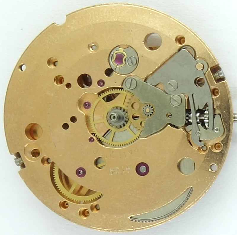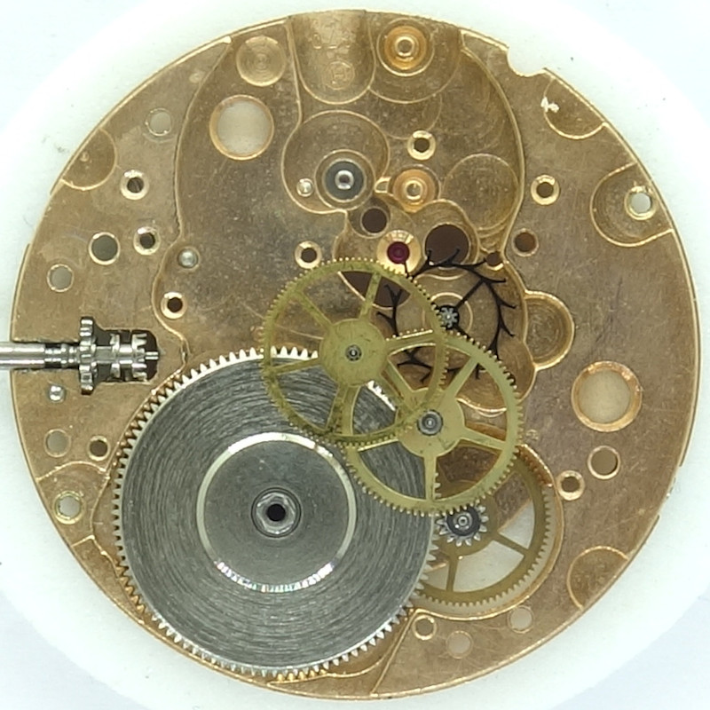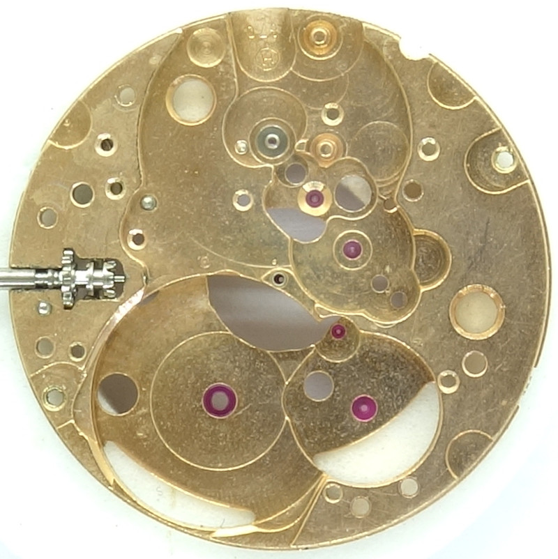 Den damals sehr modernen Räderwerksaufbau verwendet ETA bis heute in seinen Werken: Federhaus, Großbodenrad, Kleinbodenrad, direkt angetriebenes Zentralsekundenrad und schließlich das Ankerrad.