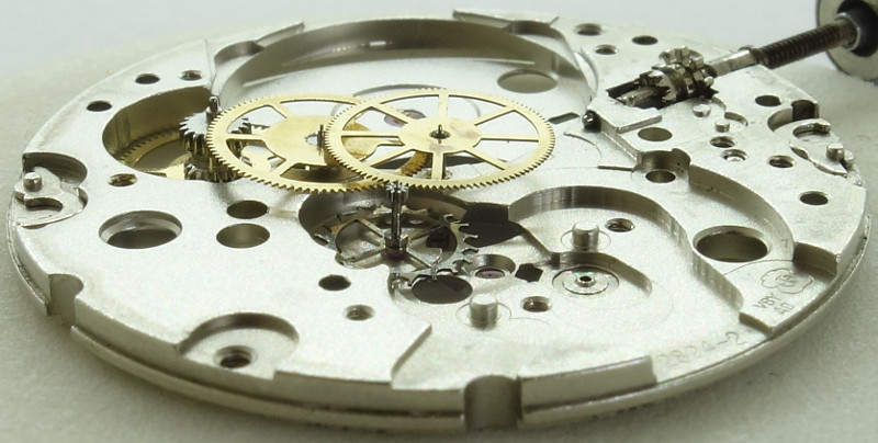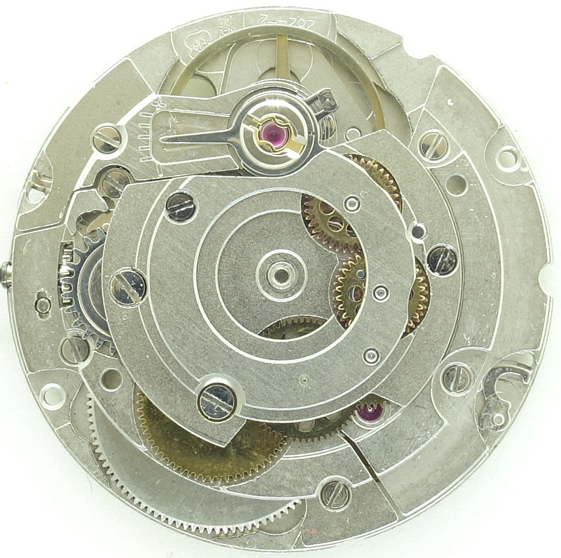 Die Grundplatine zeigt nicht nur, dass alle wichtigen Lager (mit Ausnahme der Zentralsekunde) mit Steinen ausgestattet sind, man sieht auch, dass es sich hier um ein Werk mit indirekt geführtem Zeigerwerk handelt - eine moderne Konstruktion, die unter anderem von ETA Anfang der 1950er Jahre eingeführt wurde.