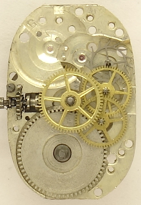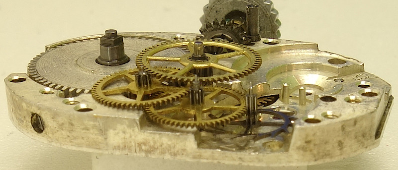 Der Aufbau des Räderwerks mit seinen filigranen Zahnrädern ist ganz klassisch, mit direkt angetriebenem zentralen Minutenrad, gefolgt von Kleinbodenrad, Sekundenrad und Stahl-Ankerrad. Alle Räder sind für die geringe Größe des Werks recht groß ausgeführt.