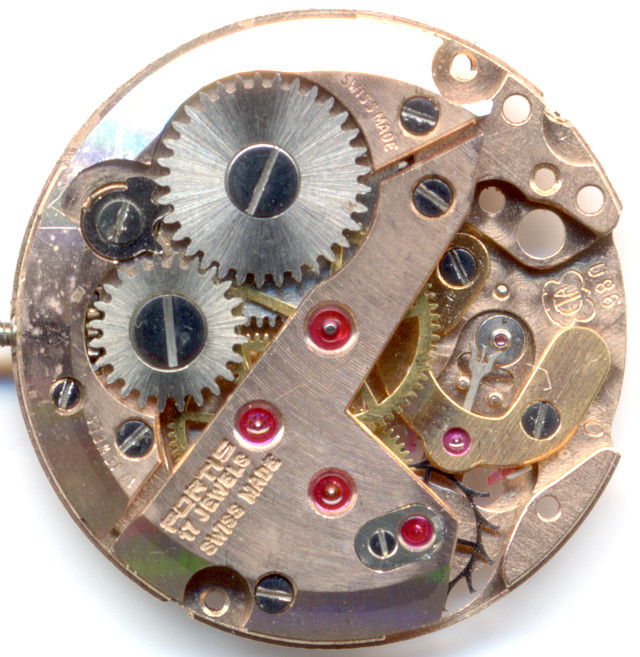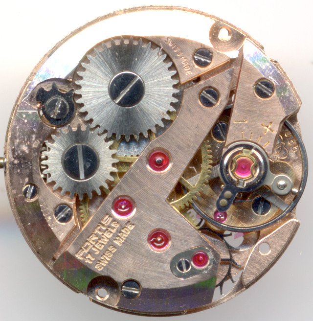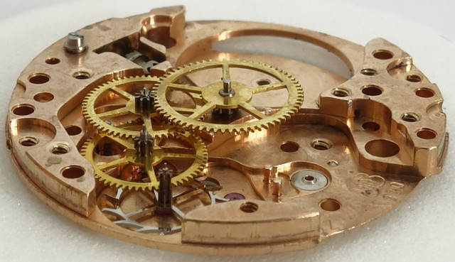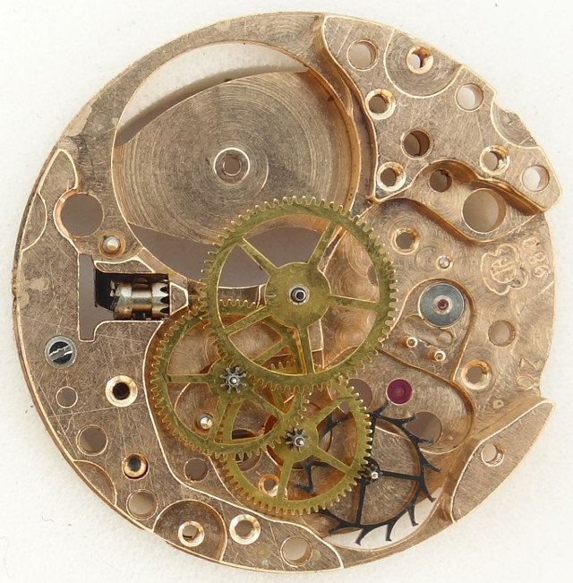Das Werk, das vermutlich Ende der 40er Jahre debutierte, war in zwei Ausführungen erhältlich, bei der Version I hatte die Winkelhebelfeder ihr Öffnung Richtung “3”, bei Version II Richtung “6”. Leider fehlt genau diese Feder bei dem hier gezeigten Exemplar, daher ist keine eindeutige Idenfizierung mehr möglich.