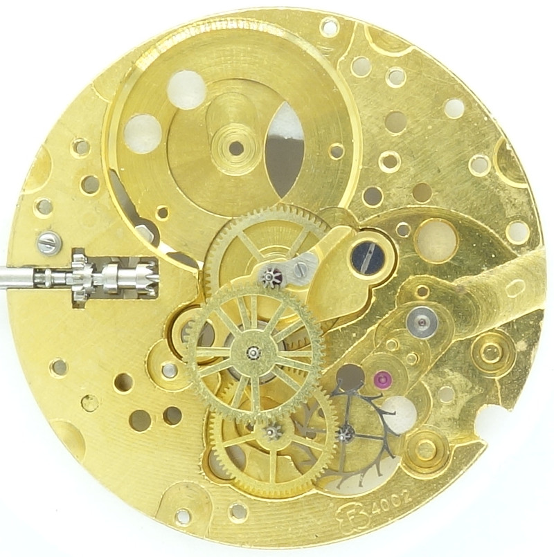 Ohne Automaticmodul entspricht das Felsa 4002 dem Kaliber Felsa 4012. Man kann gut erkennen, wie der Eingriff des Automaticmoduls in das Kronrad in Position 8:30 Uhr erfolgt.