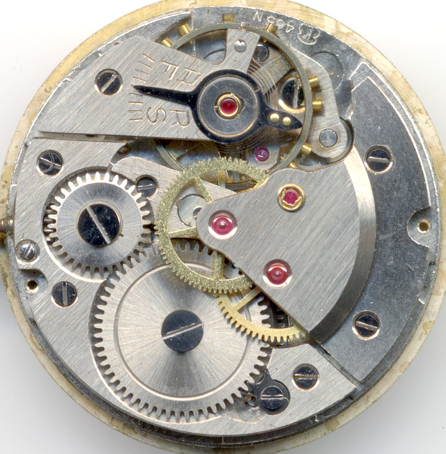 Das Räderwerk entspricht ebenfalls dem Standard der 50er Jahre: Direkt angetriebenes Minutenrad, darüber Kleinboden- und Zentralsekundenrad und schlußendlich das Ankerrad.