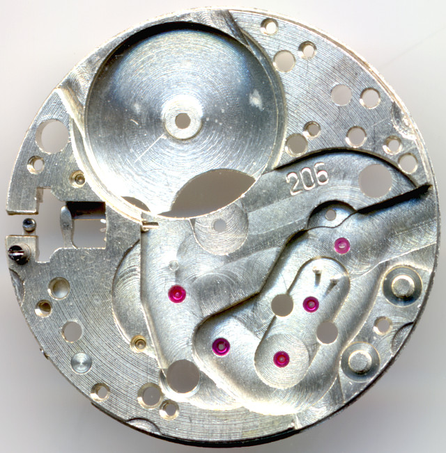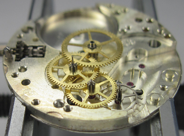Der Aufbau ist ebenfalls konventionell, auf “6” liegt das Sekundenrad, bei “7:30” das Kleinbodenrad und in der Mitte das Minutenrad. Alles im Kraftfluß.