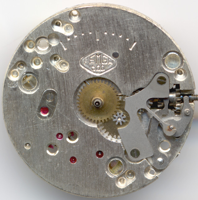 Zifferblattseitig ist sowohl die gravierte Minuterie (wichtig zum Regulieren des Werks in ausgebautem Zustand), als auch die große Femga-Punze gut sichtbar. Die verschiedenen Ausführungen dieses Werks wurden alle mit derselben Punze “FEMGA 500” markiert, die genaue Bezeichnung erfährt man aus der einschlägigen Literatur.