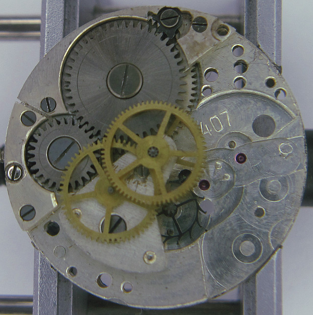 Video on YouTubeAnfang der 50er Jahre, als dieses Werk in Annemasse (Frankreich) auf den Markt kam, waren gerade Werke mit zweistöckigem Werkaufbau en vogue: Das vom Federhaus direkt angetreibene Minutenrad liegt unter der unteren Brücke, während darüber Kleinbodenrad, direkt im Kraftfluß befindliches Sekundenrad und das Ankerrad liegen: