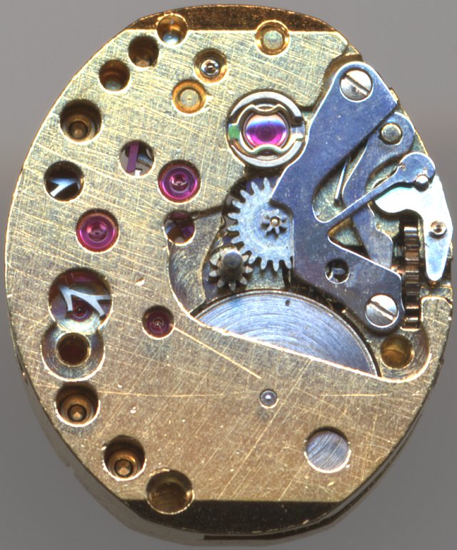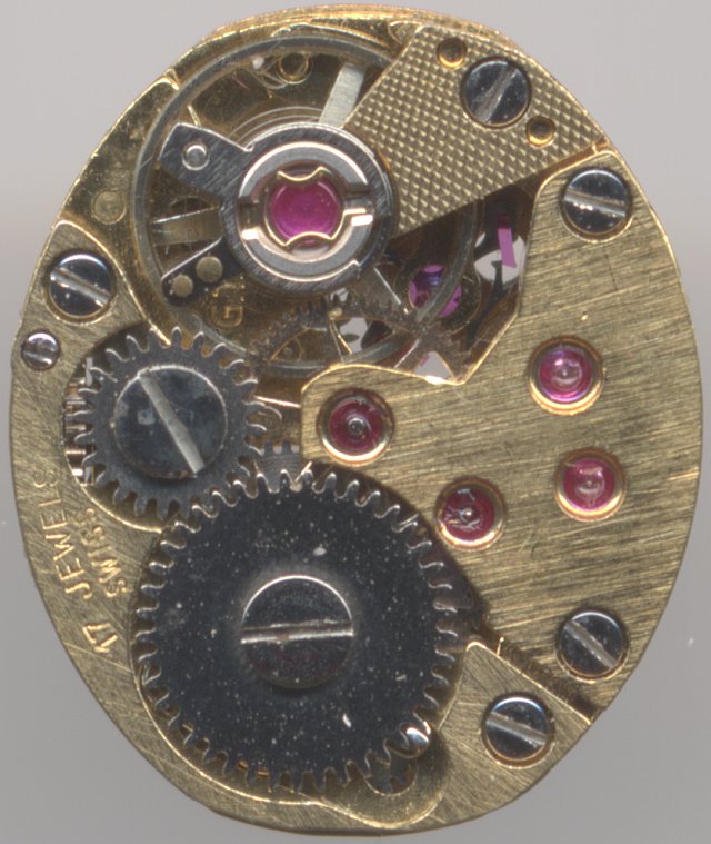 Dies ist ein Damenuhren-Formwerk, 5 3/4 x 7 Linien. Es ist mit “74E4” markiert, läßt aber weitere Identifikationsmerkmale vermissen.