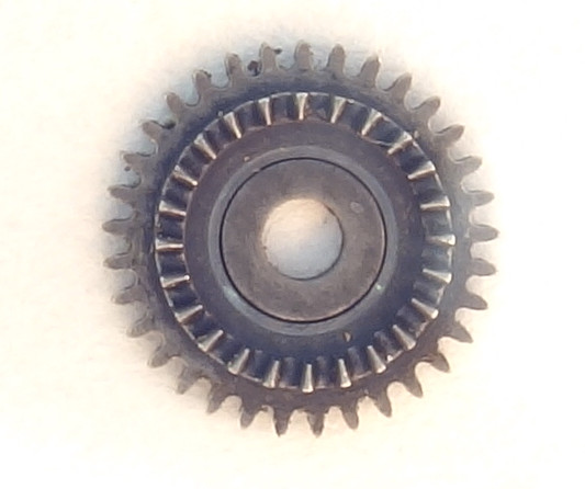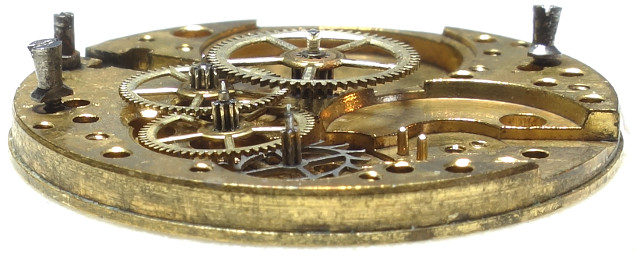 Eine kleine Besonderheit bei diesem Werk ist, dass das Kronrad zwei Verzahnungen besitzt, einmal den normalen äußeren Zahnkranz und einmal eine Verzahnung auf der Unterseite, die mit dem Kupplungsrad des Aufzugs in Verbindung steht.