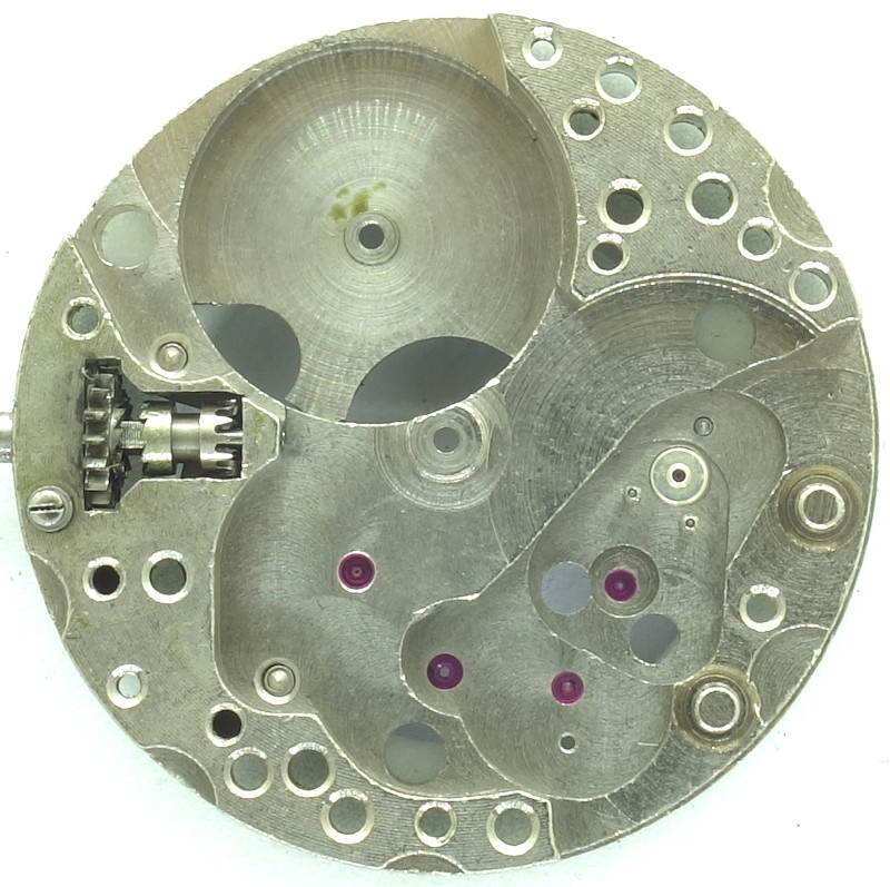 Die Grundplatine dieses 10 1/2 linigen Werks zeigt die ordentliche Qualität des Werks, alle wichtigen Lager sind mit Steinen versehen: