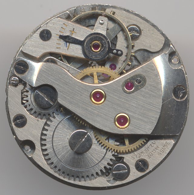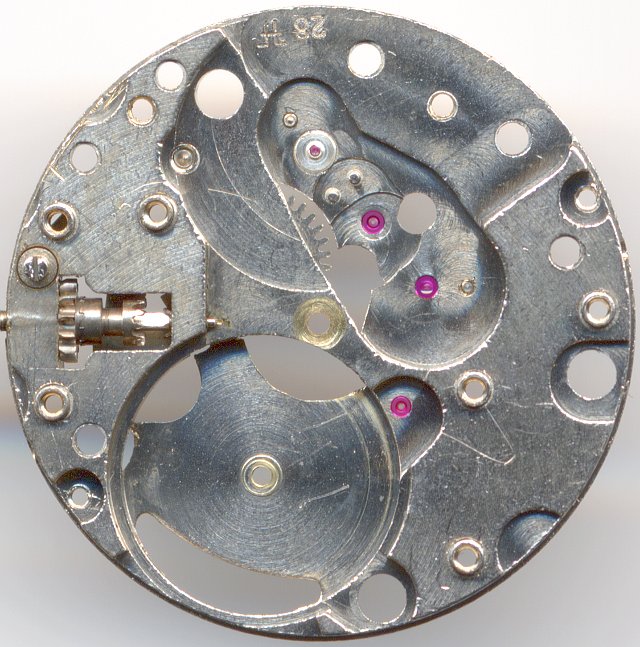 Zifferblattseitig findet man, wie bei besseren Werken üblich, den Kupplungsaufzug, sowie einen Deckstein für das Ankerrad, und eine Vorbereitig für alternative Stoßsicherungen der Unruh.