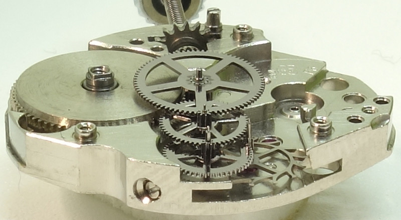 Der Räderwerksaufbau mit seinem modernen, schmucklosen Rädern, macht der Bezeichnung “Standard” alle Ehre: Auf das vergleichweise große Federhaus folgen das direkt angetriebene, zentrale Minutenrad, gefolgt von den beiden kleinen Kleinboden- und Sekundenrädern, sowie dem wieder recht großen Stahl-Ankerrad, das zum Teil unter den beiden Lagern von Kleinboden- und Sekundenrad läuft.