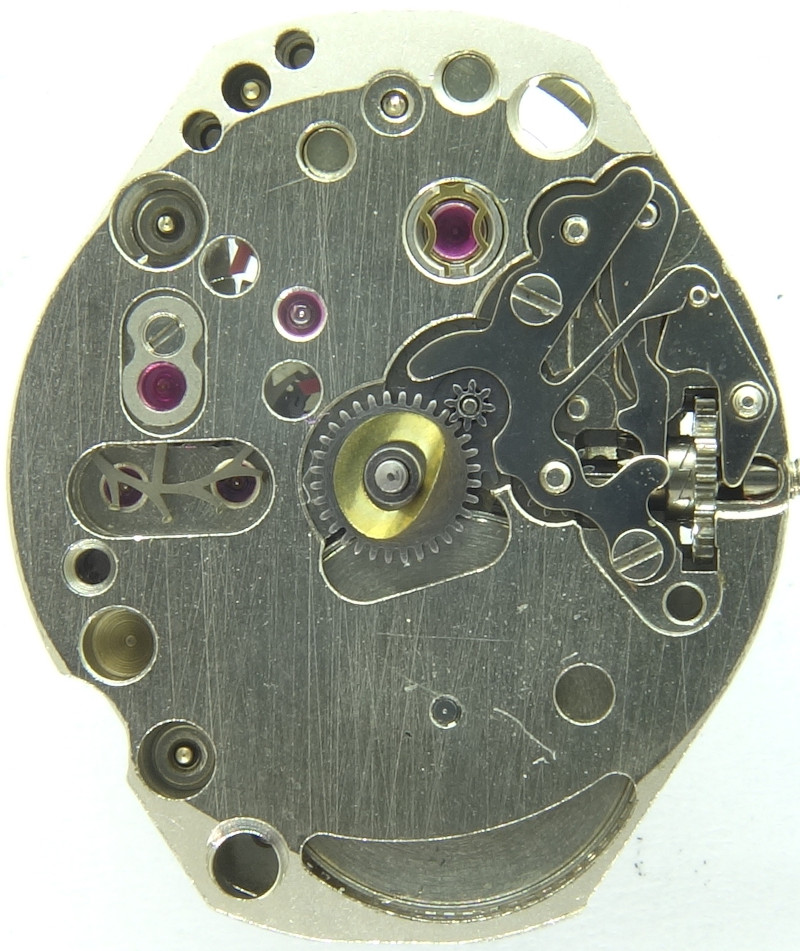 Zifferblattseitig zeigt sich das erwartete Bild, wobei interessanterweise das Ankerradlager sogar mit einem Deckstein versehen ist. Werksseitig wäre ein Deckstein noch besser gewesen, aber zifferblattseitig ist er auch nicht ganz verkehrt.