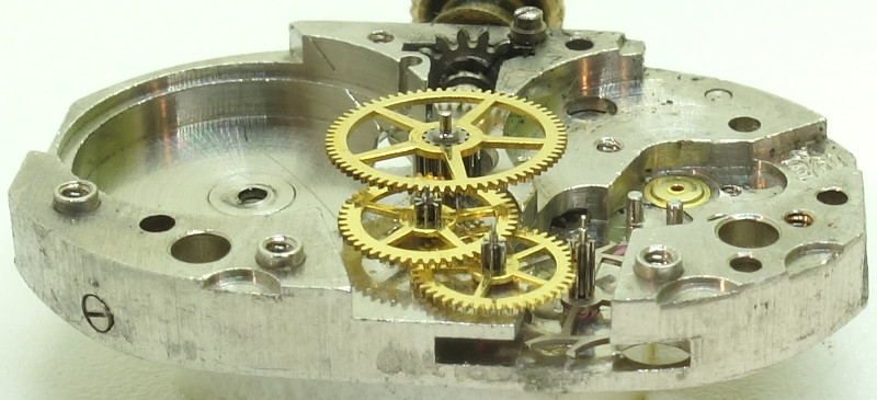 Natürlich nutzt das Förster 60 einen Kupplungsaufzug, diesen und seine interessant geformte Winkelhebelfeder kann man gut erkennen, genauso wie die werkksseitige KIF-Flector-Stoßsicherung.