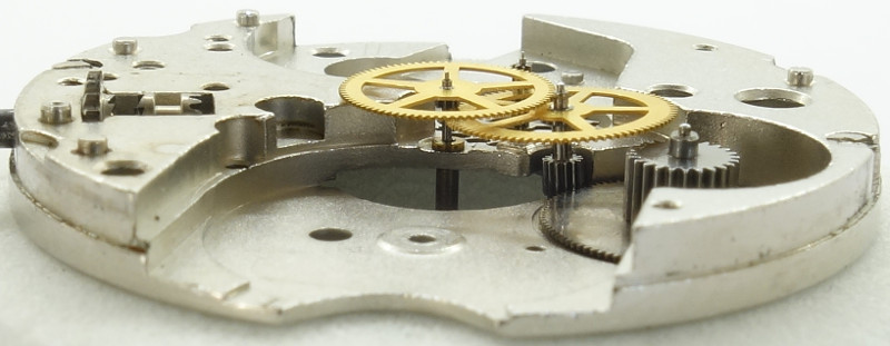 Wenn die Dreiviertelplatine des Räderwerks aufgesetzt ist, erkennt man gleich die teilweise vertieft ausgeführten Aufnahmen für das Rädwerk des Automaticmechanismus. Auch hier konnte wieder in klein wenig Höhe eingespart werden.