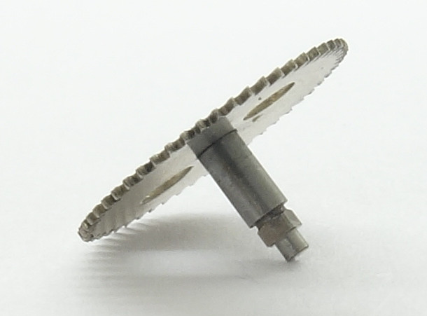 Das Sperrrad besitzt eine Achse, an deren Ende ein Vierkant sitzt, welcher in den Federhauskern eingreift. Weil es sich hier um ein einziges Bauteil handelt, gibt es keine Schraube auf dem Sperrad, was ein klein wenig Höhe bei diesem ohnehin relativ hoch bauenden Werk einspart.