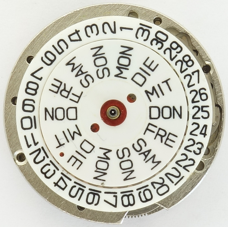 Die Wochentagsscheibe ist ebenso, wie der Datumsring, aus Plastik. Sie besitzt auf ihrer Rückseite vierzehn halbmondförmige Nasen, die für die Weiterschaltung mit Hilfe des blauen Schaltsrads zuständig sind. Der federnd gelagerte Ring bei 8 Uhr ist für die Rastung der Wochentagsscheibe zuständig.