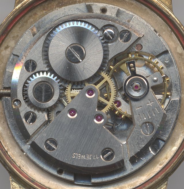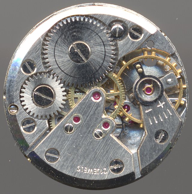 Das Guba 1200 ist ein bemerkenswertes Herrenuhrenwerk. In der Literatur ist die Firma Guba praktisch unbekannt, und trotzdem finden sich ihre Werke, Kaliber 25 und das hier gezeigte Kaliber 1200 immer wieder in Uhren, die in den 50er Jahren gebaut wurden. Da dieses Werk keinerlei Markierungen aufweist, ist eine Identifizierung recht schwierig, allerdings ist die Winkelhebelfeder so charakteristisch geformt, daß es sich auf Dauer dann noch nicht seiner Identifizierung entziehen kann.