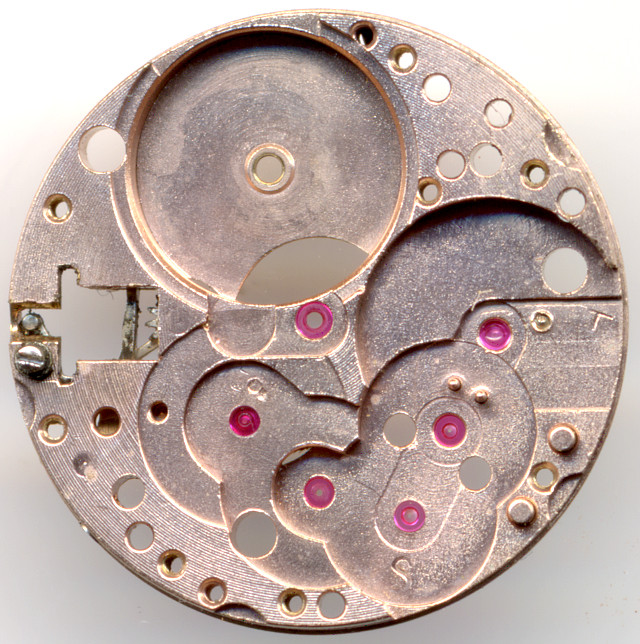 Zifferblattseitig erkennt man den Kupplungsaufzug mit der charakteristischen Winkelhebelfeder, sowie die eingeschlagene Kaliberbezeichnung. Die alte Version dieses Werks unterscheidet sich hier deutlich, vor allem die Aufzugspartie mit der Winkelhebelfeder ist deutlich anders ausgeführt.