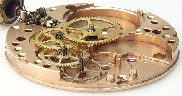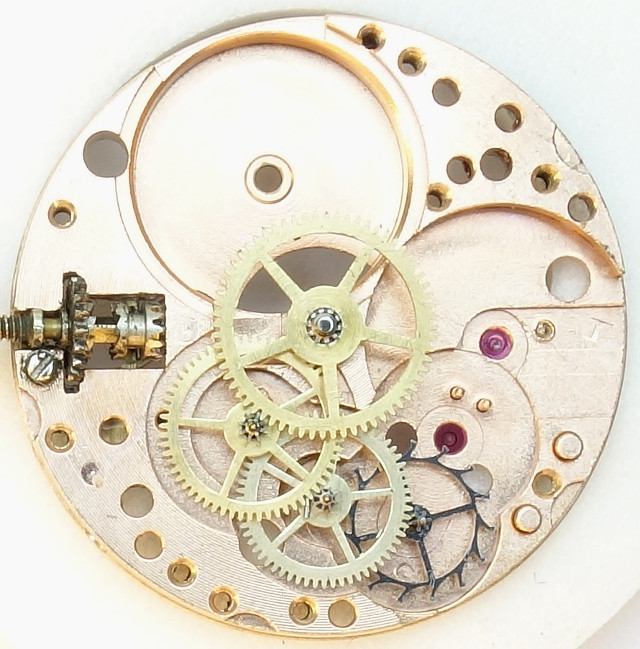 Das Werk ist in zweifacher Hinsicht bemerkenswert: Zum einen ist es rotvergoldet, zum anderen ist bereits das Minutenrad steingelagert, in den frühen 50 Jahren war das noch nicht üblich. Auf diese Weise kann das Werk bereits mit 17 Steinen aufwarten.
