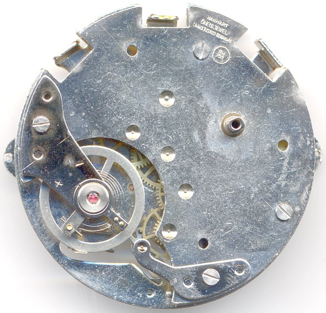 Auf der Zifferblattseite befindet sich die Kulissenschaltung, die für das Starten und Stoppen, sowie für die Nullstellung zuständig ist. Beim Start/Stopvorgang wird die Unruh bewegt, so daß stets sichergestellt ist, daß sie sauber anschwingt.