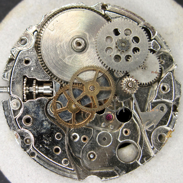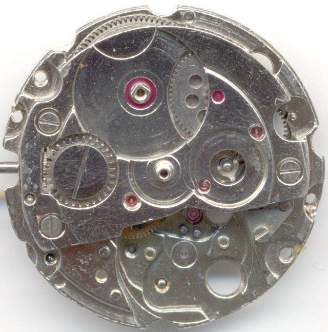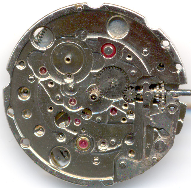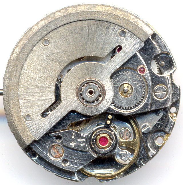 Der Datumsmechanismus besitzt eine Schaltrad mit einem Plastikfinger, der dafür sorgt, daß der Datumsring nur vorwärts weitergeschaltet werden kann. Dies ist notwendig, um Datumsring und Wochentagsscheibe (welche auch rückwärts schalten kann) zu entkoppeln.