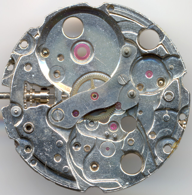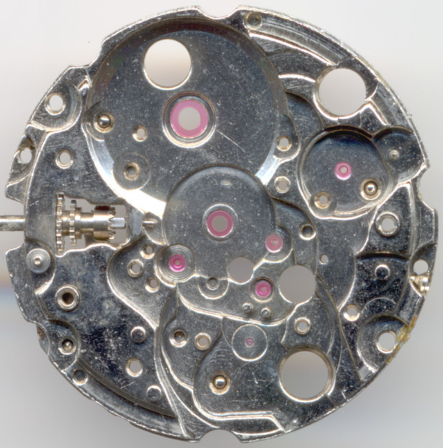Anhand der Grundplatine erkennt man, daß sämtliche Lager, sogar Minutenrad und Federhaus, mit Lagersteinen ausgestattet sind. Mehr geht nicht.