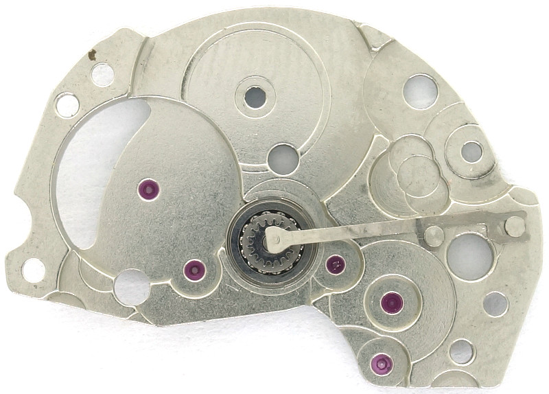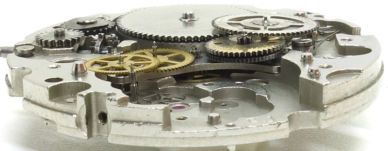 Das Räderwerk fällt sehr umfangreich aus, da sowohl das normale Räderwerk zur Zeitanzeige, das Räderwerk für den Handaufzug und das Räderwerk für den automatischen Aufzug unter ein- und derselben Brücke gelagert sind.