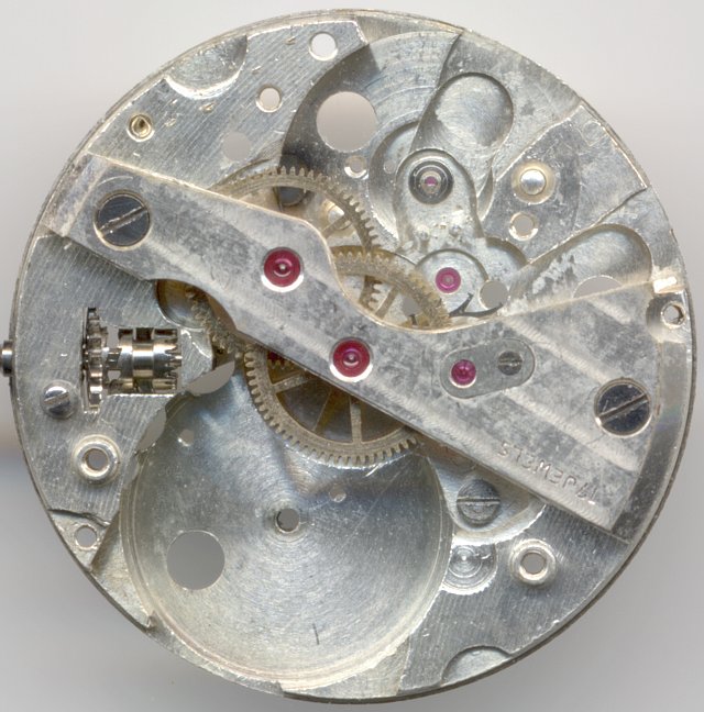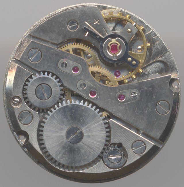 Das Minutenrad wird - für damalige Verhältnisse modern - unter einer eigenen Brücke gelagert; um das konzentrisch laufende Sekundentrieb optimal zu lagern wurde ein loser(!) Lagerstein auf die Brücke gelegt.