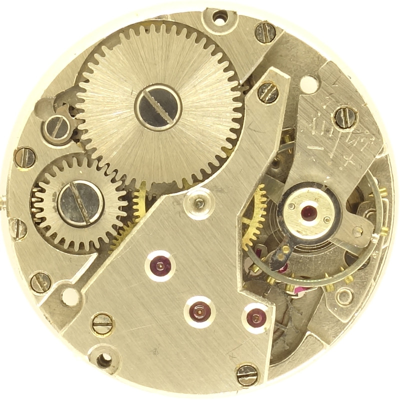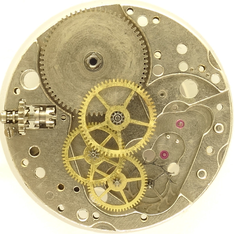 Der Räderwerksaufbau ist lehrbuchgemäß für ein Handaufzugswerk: Das Federhaus treibt das zentrale Minutenrad direkt an, gefolgt vom Kleinbodenrad, Sekundenrad auf 6 Uhr (das zifferblattseitig den dezentralen Sekundenzeiger trägt) und Stahl-Ankerrad.