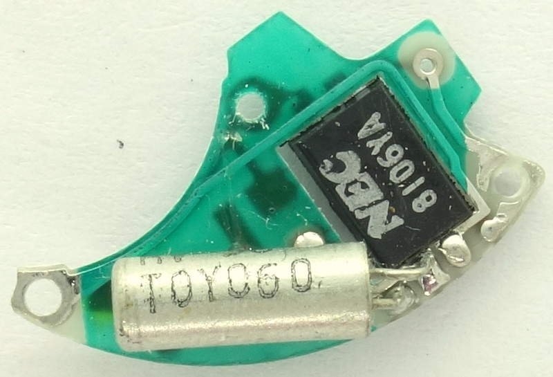 Der Elektronikblock ist sehr einfach aufgebaut, auf der Zifferblattseite befinden sich der runde 32kHz-Quarz und das IC vom Typ NEC 8106YA, auf der Werksseite ein Kondensator und der Trimmkondensator, mit dem die Schwingfrequenz des Quarzes möglichst exakt auf 32768Hz abgestimmt wird.