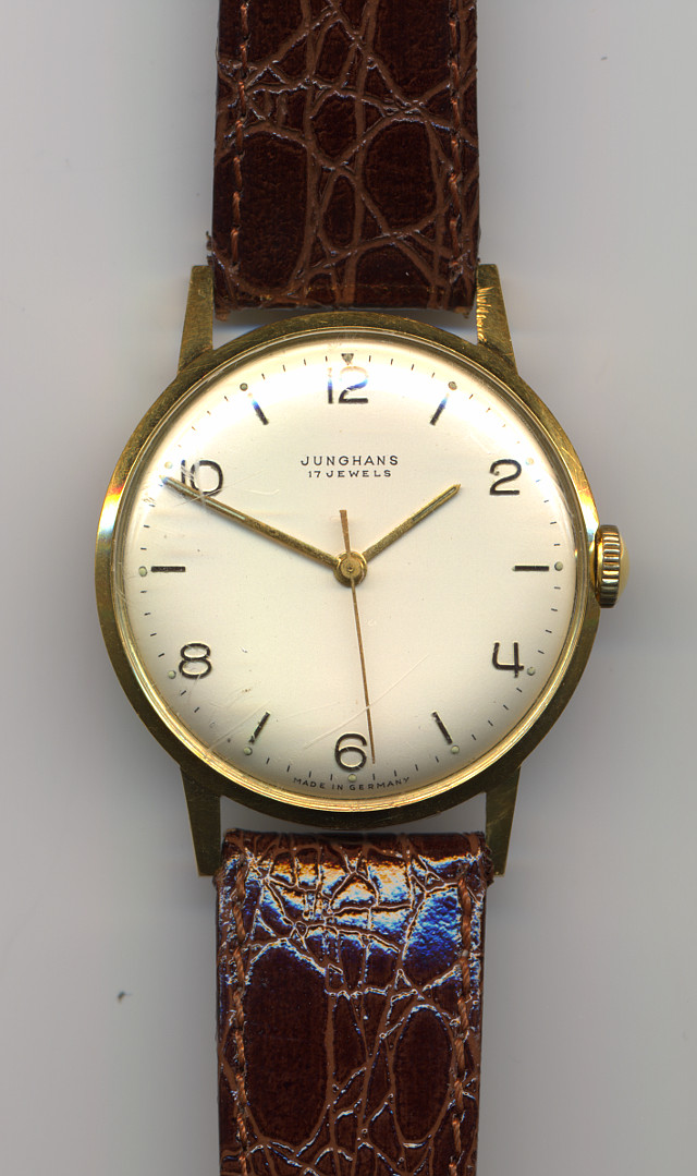 Anders, als die meisten gängigen Junghans-Werke hat es die “volle” Herrenuhrwerksgröße von 11 1/2 Linien. Wegen der dadurch sehr groß ausgefallenen Unruh (und auch, weil es seinerzeit noch Usus war) tickt es gemächlich mit 18000 Halbschwingungen pro Stunde.
